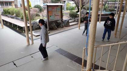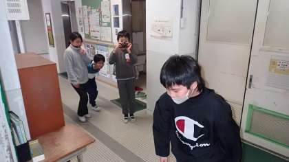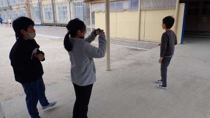 何をしているのかというと、英語を使って学校案内をしている様子を動画に撮っているところです。“This is Teacher's office.”“Go straight.”“Turn right.”など、英語で上手に説明しています。撮影した動画は梅津北小学校の4年生と交換して、互いの学校紹介をすることになっています。みんな張り切って学校案内をしていました。