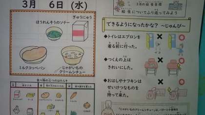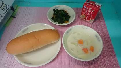 今日の「じゃがいものクリームシチュー」も、もちろん給食調理員さんの手作りの「ルー」です。コクがあるのにさらっと歯触りのよいルーで、じゃがいもや鶏肉をおいしくいただきました。「ほうれん草のソテー」は、野菜の甘みがたっぷりで、クリームシチューとの相性ぴったりの献立でした。