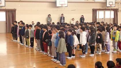 1年生は、6年生にお世話になったこと、感謝の気持ちを伝え、「世界中の子どもたちが」を替え歌にした「うめづ小の6年生が」をプレゼントしました。