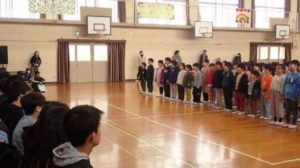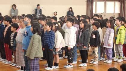 1年生らしく明るい歌声で「♪うめづしょう〜の6年生〜が」と歌い、1年生の素直な気持ちを贈りました。6年生の子どもたちも、笑顔で聞いていました。