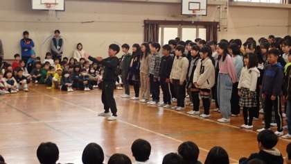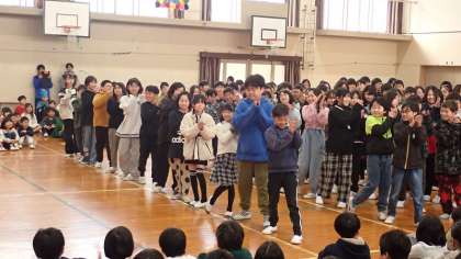 「6年生に、歌を歌います。」という呼びかけで、歌を歌うのかなと思ったら、「ちょっと待った!」の声。5年生が、みんなで踊りだします。途中からは6年生も巻き込んで、明るく楽しくダンスを踊りました!