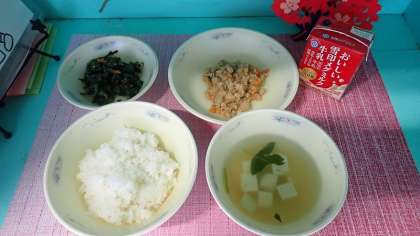 「おからそぼろ丼」は、鶏ひき肉やおからパウダーと、たまねぎ、にんじん、しいたけなどが入った具をごはんと一緒にいただくまぜごはんです。甘みのある具とごはんとの相性がぴったりで、いつも以上にごはんをおいしくいただくことができました。「みつばのすまし汁」は、すき通ったきれいなすまし汁で、出汁の風味がとてもよく出ています。みつばのほのかな苦みがアクセントになり、とてもおいしくいただくことができました。