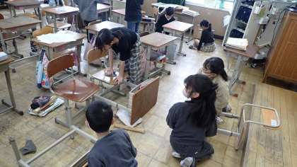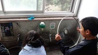 天井に備え付けられている扇風機も、カバーを外して洗いました。水が冷たかったですが、みんなが一生懸命がんばってくれたので、ピカピカになりました。