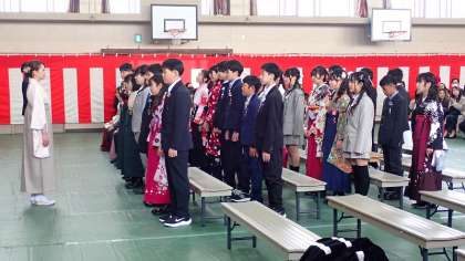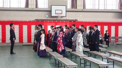 6年生にとっては、小学校生活最後の1日です。いつもと同じ体育館ですが、いつもと違う厳粛な雰囲気の中、卒業証書授与式が始まりました。担任の先生を先頭に、ちょっと緊張した表情で卒業生が入場しました。