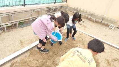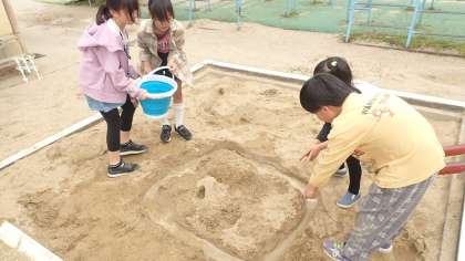 今日は、4年生になった子どもたちが学校に遊びに来ていました。造形砂場で堀のあるお城や山をつくり、堀には水を流し込んで楽しんでいました。