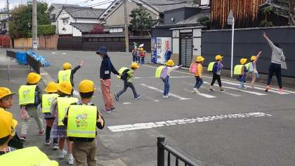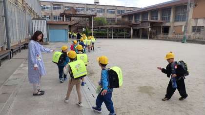 運動場では下校のコースごとに整列し、引率の先生と一緒に下校しました。見送りの先生に「さようなら!」と元気にあいさつしました。横断歩道では、左右を確認して手をあげてわたることができました。