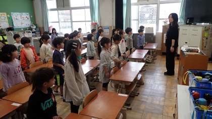1年生の教室では、元気な朝のあいさつと健康観察をしています。