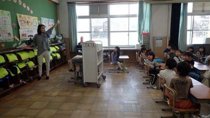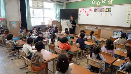 気持ちのよい「おはようございます」のあとは、健康観察をしました。1年生のみんなが担任の先生やまなびの先生の名前を呼ぶと、先生もうれしくて「はい元気です!」と返事をしました。