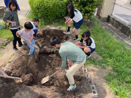 向かい合った友だちと歩く場所を掘り切ったときは、「やったー。つながったよ!」と声を出していました。