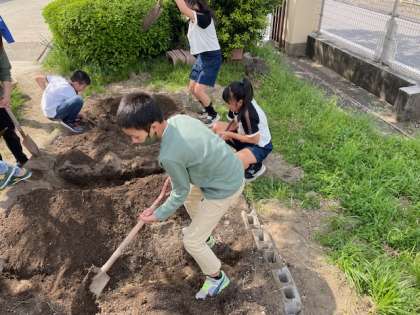 今年度から、むくのき学級の広くなった畑を見て、子どもたちは喜んでいました。そして、新しく入った1年生とともに、畑で畝を作りました。