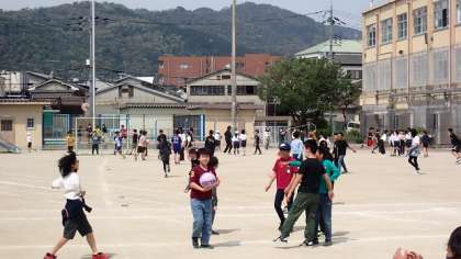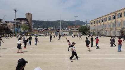 中間休みの運動場では、たくさんの子どもたちが遊んでいます。明日からは、給食が始まります。お天気が心配ですが、雨が降らなければ、お昼休みも放課後もたくさん遊んでくださいね。