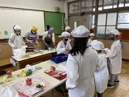 いよいよ給食が始まりました。7人で力を合わせて配膳をしています。「スパゲッティ早く食べたいな。」と子どもたちも今日の献立を楽しみにしていたようです。