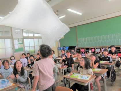 ミニ実験では、温められた空気で袋をふくらませる活動をしました。ぷかぷかと浮かぶ大きな袋に、子どもたちは大盛り上がりでした!
