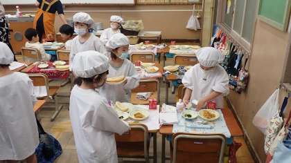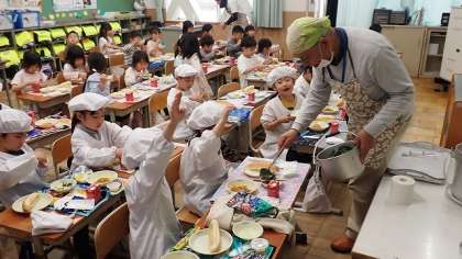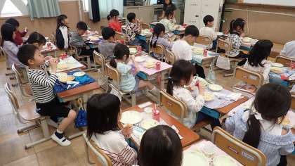 はじめての給食当番でしたが、先生のお話をよく聞いて、こぼさないように慎重に配っていました。みんなで「いただきます!」をした後は、いよいよ食事スタートです。はじめは少なめに配ってもらいましたが、何度もおかわりしていっぱい食べることができました。