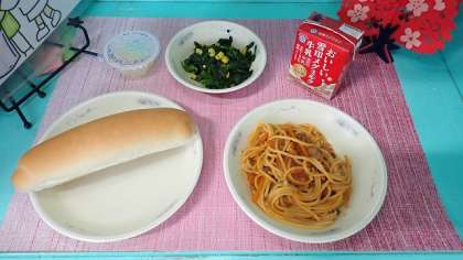 1年ではじめの給食は「入学祝い」献立で、今年も子どもたちの大好きな「スパゲティのミートソース煮」と「ほうれん草のソテー」です。待ちに待った給食を、子どもたちは朝から楽しみにしていました。スパゲティは、牛ひき肉と玉ねぎやにんじんとトマト味のミートソースの相性がぴったりで、おいしくいただきました。「ほうれん草のソテー」は、コーンが入って色どりもよく、しょうゆ味でさっぱりととてもおいしくいただくことができました。