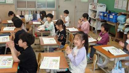 みんなで手拍子をしながら「小犬のビンゴ」歌っていました。「B・I・N・G・O」の歌詞を歌わない部分では手拍子を打ちますが、思ったより難しく、失敗も楽しみながらみんなで一緒に歌いました。