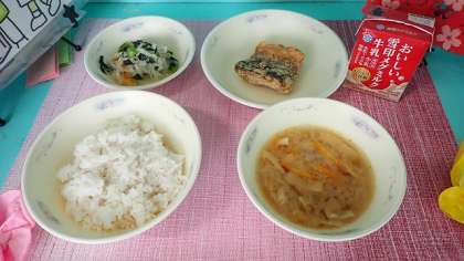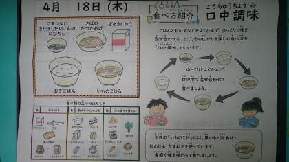 「さばのたつたあげ」は、さばの切身に米粉と片栗粉で衣をつけ、油でからっと揚げています。さくさくの衣と、ぷりぷりのさばの身を一緒に味わっていただきました。「いものこ汁」には、ほくほくの里いもがたくさん入っています。たくさんの具材と一緒においしくいただきました。