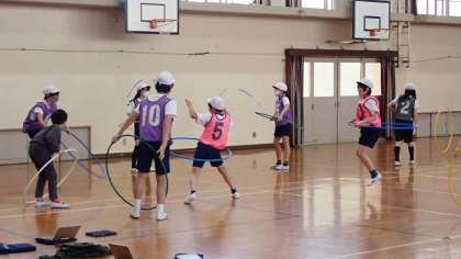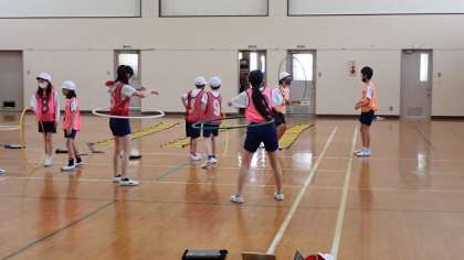 体育館をのぞくと、みんながフラフープを使った運動をしていました。腰でフラフープを回す子や、フープを転がして友達とパスし合う子などいろいろな運動をする様子が見られました。