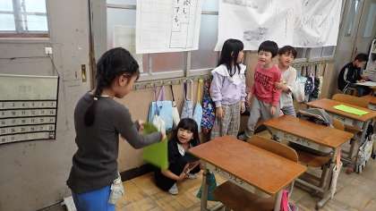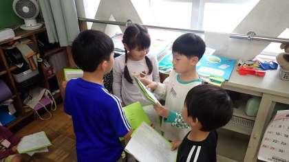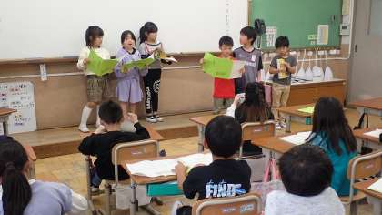 グループごとに、明日の授業参観で披露する音読の練習をしています。動きを取り入れているグループもありました。聞き合いの場では、お客さん役の子どもたちからもアドバイスが出ていました。明日の音読発表がこれまでで一番の音読になるとよいですね。