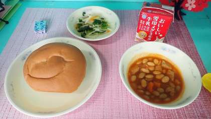 「ポークビーンズ」は、豚肉と大豆がたっぷり入っています。やわらかい豚肉とほくほくの大豆にトマト味がよく絡み、とてもおいしくいただくことができました。食べ応えも満点で、子どもたちも大満足の様子でした。