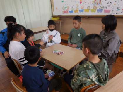 「たけのこにょっき」というゲームでは、みんなが友だちのことを気遣って、楽しくゲームをすることができました。UNOやトランプのカードゲームもなかなかの接戦になり、笑顔いっぱいのひと時となりました。