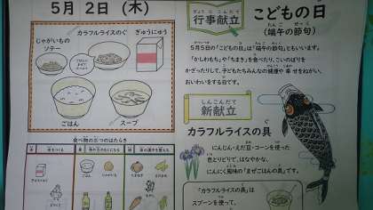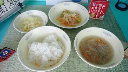 今日の「カラフルライス」は新献立です。鶏肉・たまねぎ・にんじん・コーン・枝豆が入っています。しお、こしょう、ガーリックパウダー、しょうゆで味付けがされていて、ごはんと混ぜるとちょうどにんにく風味です。にんじんの赤、コーンの黄色、枝豆の緑といろあざやかで、見た目にも楽しい献立でした。