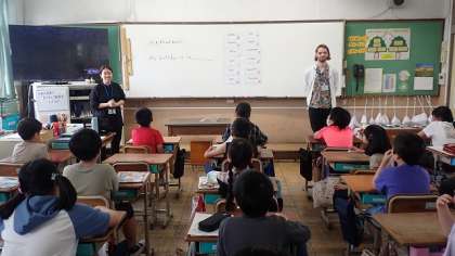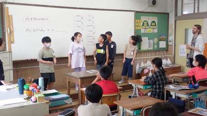 自分の誕生月を伝える表現で、自分が何月生まれかを話しています。前に出た子が“My Birthday is in June.”と言うと、「June、6月か。」「一緒や。Me too!」という声も聞かれました。英語の月を表す言い方がしっかり身についていますね。
