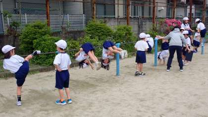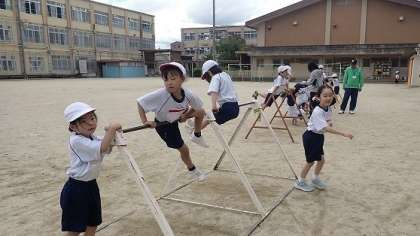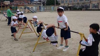 1年生は、体育の「てつぼうあそび」の学習をしています。