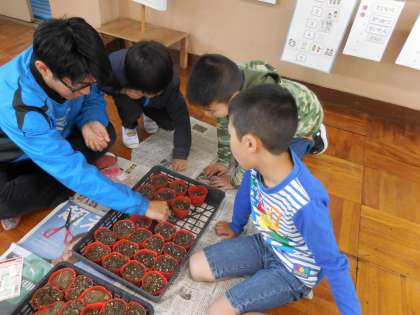 種がより発芽しやすいように、ポットに種を蒔いていきました。今年も様々な種類の夏野菜や植物を育てていきたいと思います。今日は、イエローポップというポップコーンになるとうもろこし、そして、ヘチマ、ひょうたんの種を蒔きました。芽が出てくるのを楽しみにしている子どもたちです。