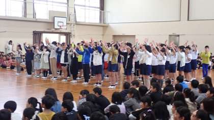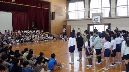 2〜6年生は、1年生を迎える会の出し物の中で、梅津小学校の学校紹介をしました。