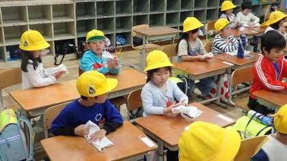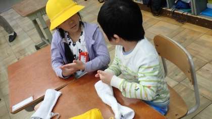 今は6年生のお兄さん・お姉さんたちが教室のそうじをしてくれていますが、これからは自分たちで掃除をしていくようになります。先生から、ぞうきんの絞り方を教えてもらって、自分のぞうきんで練習しました。