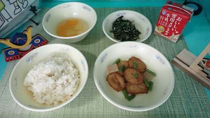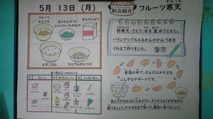 「ほうれん草とじゃこの炒めもの」は、ほうれん草にじゃこの塩気が加わって、一緒に食べるととてもおいしい献立でした。「フルーツ寒天」は、配るときにはさらさらなのに、食べるころにちょうど固まる不思議な献立です。みかん、パイナップルと一緒に、おいしくいただきました。