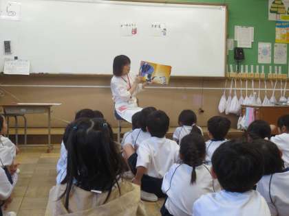 1年2組で、初めてのうめのこさんの読み語りがありました。