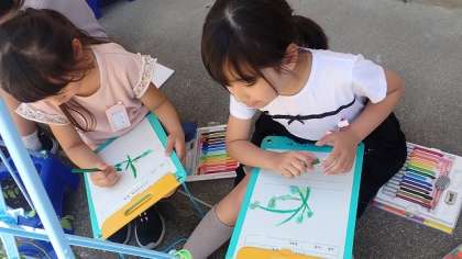子どもたちは、先週植えたミニトマトの苗の水やりをがんばっています。今日は、どんな風に成長しているかを観察カードに書きました。毎日見ている自分のミニトマトなので、小さな変化にもよく気づいていました。