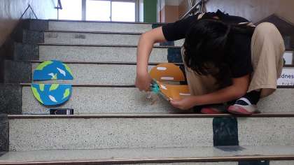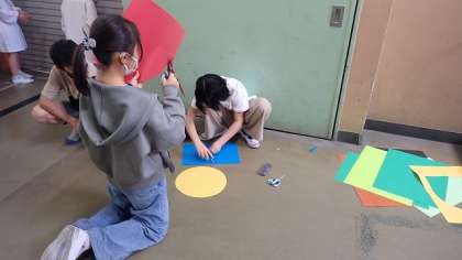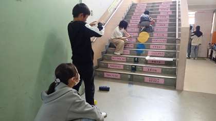 この題材では、個人で作品づくりをするのではなく、友達と協力して活動をします。校舎の中の気に入った場所で、自由に作品づくりをしました。階段の段を生かして、1つの絵をつくったり、窓ガラスを使って、窓を動かすと作品が見えるような仕掛けをしたりしました。