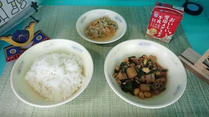 「ツナと切り干し大根のいため煮」は、新献立です。にんじん、切り干し大根、ツナをいためた後、水と調味料を加えて煮、最後に三度豆を加えて彩りよく仕上げています。「肉みそいため」は、みその味がちょうどよく、ごはんによく合う献立でおいしくいただきました。
