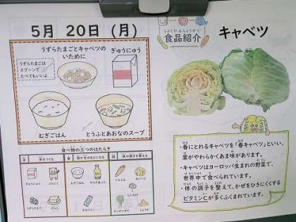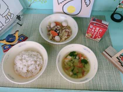 「うずら卵とキャベツのいため煮」には、うずら卵、キャベツのほかにも豚肉、にんじん、しいたけなど、とてもたくさんの具材が入っていて、ひと口でろいろな食材を一緒に味わうことができます。ごはんと一緒に食べるとちょうどよい味付け具合で、お腹いっぱいおいしくいただきました。