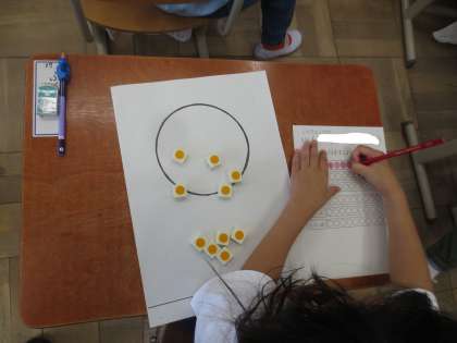 5月21日は、10個の数図ブロックを指で弾いて、円の中にいくつ入るかのゲームをしまいた。