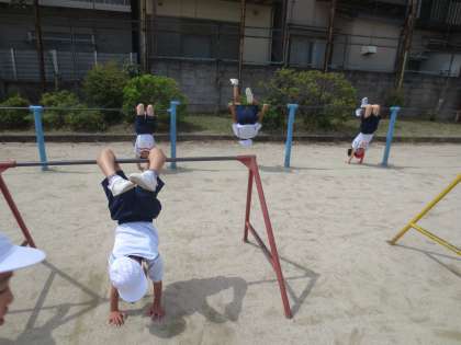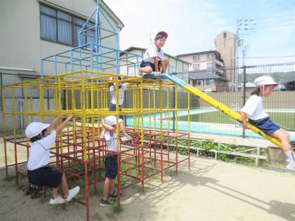 総合遊具は2階までしか上がれませんが、小さい方のジャングルジムは上まで上がることができます。