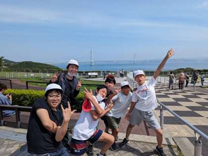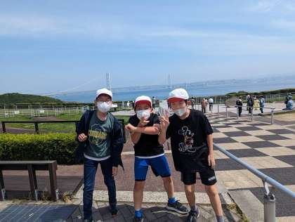 明石海峡大橋を渡り、淡路SAに到着しました。一旦休憩です。みんな元気にしています。