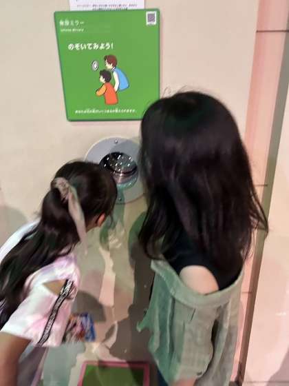 「のぞいてみよう!」と書かれた穴をのぞき込んでいます。中には何が見えるのでしょう?