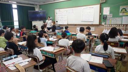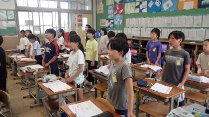 今日は、「いいことありそう」の範唱を聴き、曲の感じや特徴を感じ取りました。子どもたちからは、曲想をとらえた「はずんだ感じ」「明るい感じ」などの意見が出ました。そんな曲の感じに合わせて、歌詞唱や鍵盤ハーモニカパートの階名唱をしていました。