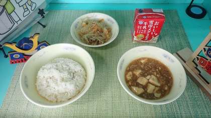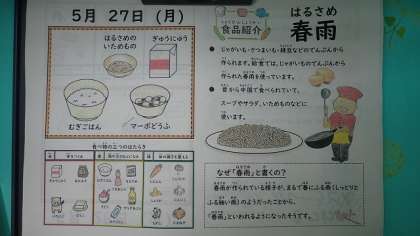 「マーボどうふ(麻婆豆腐)」は、中国の四川省で生まれた豆腐料理のひとつです。四川省の料理は、唐辛子や香辛料を効かせた辛い味付けが特徴です。給食では、ピリッとする一味唐辛子やテンメンジャンを加え、最後にとろみをつけて仕上げています。ちょうどよい辛さを楽しんでいただきました。