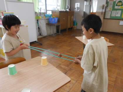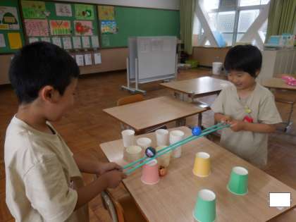 高学年の友達が交流授業に行っていたので、教室には低学年の友達だけが残っていました。2人で協力をして、ボールをどんどん移し替えていきます。力加減やどこの紙コップに移すのかなど、息を合わせて慎重に取り組んでいました。