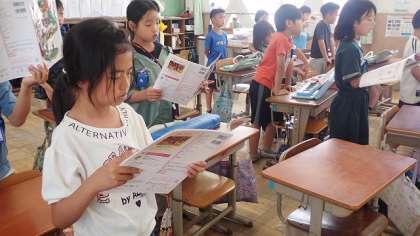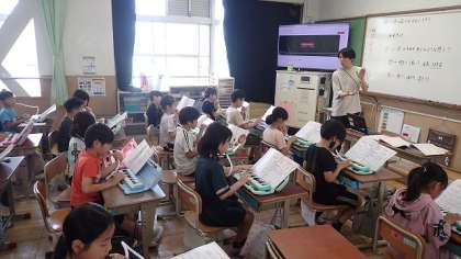 「海風きって」の曲を聴き、曲の雰囲気をつかんでから、鍵盤ハーモニカで旋律を演奏したり、歌詞唱したりしました。鍵盤ハーモニカでは、指くぐりや指またぎがむずかしいところですが、少しずつできるようになっていってほしいと思います。