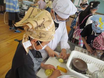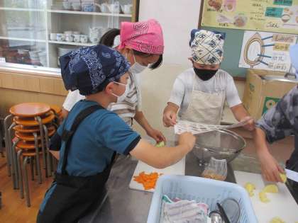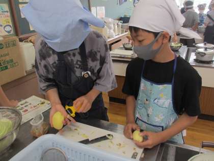 事前に決めた担当ごとに、野菜の皮をむいたり切ったりしていきます。おいしいゆで野菜になるように、慎重に、ていねいに切っていきました。