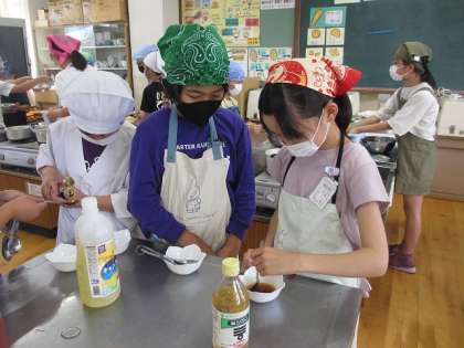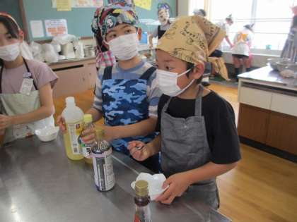 野菜をゆでるほかにも、野菜にかけるソースも自分たちで作りました。「オーロラソース」「和風ソース」「中華風ソース」の中から班で2つを選んで作りました。