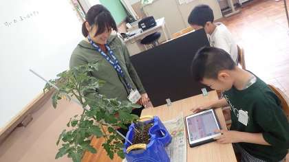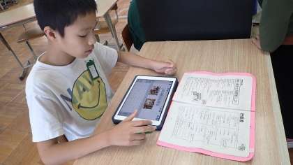 1年生は、なぞり書きをしています。線からはみ出ないようにていねいに書いていました。5年生は、タブレット端末を使って、育てている植物の観察記録を付けていました。6年生は、修学旅行の出来事をふり返ってまとめていました。みんな、集中して取り組んでいました。