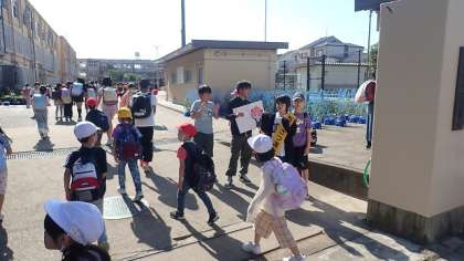 今日は、朝から太陽が降り注ぎ、気持ちのよい朝になりました。計画委員会の子どもたちも元気にあいさつをしています。今日が遠足の1・2年生の子どもたちは、みんなうきうき気分で元気よく登校しました。