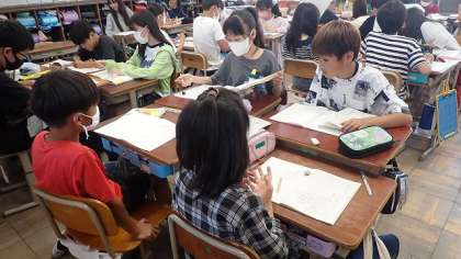6月に入り、もうすぐ梅雨を迎えますが、今日は「梅雨」を題材にして梅雨ならではの楽しみを表す短歌づくりをしました。「梅雨」からイメージを広げて、思いつく言葉をたくさん出し合いました。「蒸し暑い」「じめじめする」「外で遊べない」など、ちょっと暗いイメージの言葉が出てきましたが、「あじさい」「晴れ間」「みずたまり」などの言葉から、うれしい気持ちになる瞬間を思い浮かべ、5・7・5・7・7・の31音で表現しました。